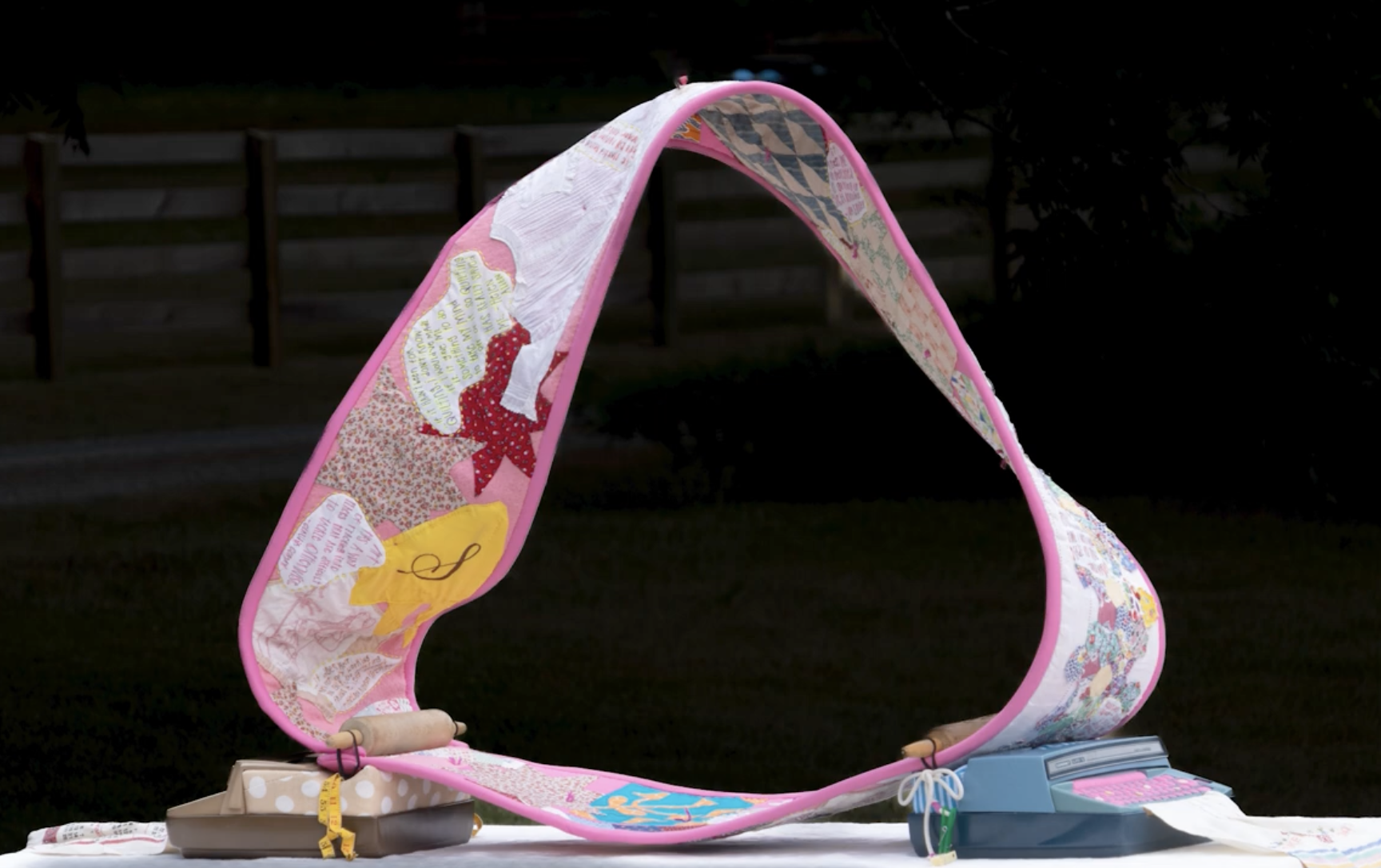 The typewriters, upholstered and skirted, their components replaced with vintage rolling pins and antique shirt buttons house 12 clips of the QSOS quilters’ interview audio. By literally pushing buttons, their voices emanate from within these contraptions, which are symbolic of “women’s work,” both household and corporate. Yet the quilt itself, represented as “endless,” flows through the typewriters as a colorful riot of words and handwork.
