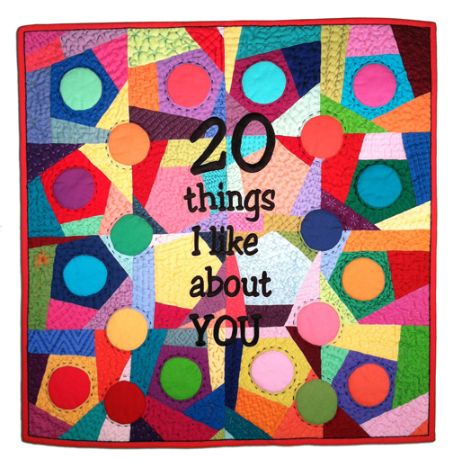 I thought, What if I quilted, “20 things I like about you”, so when you read it, whether you think of 20 or not, you’d get a smile on your lips…