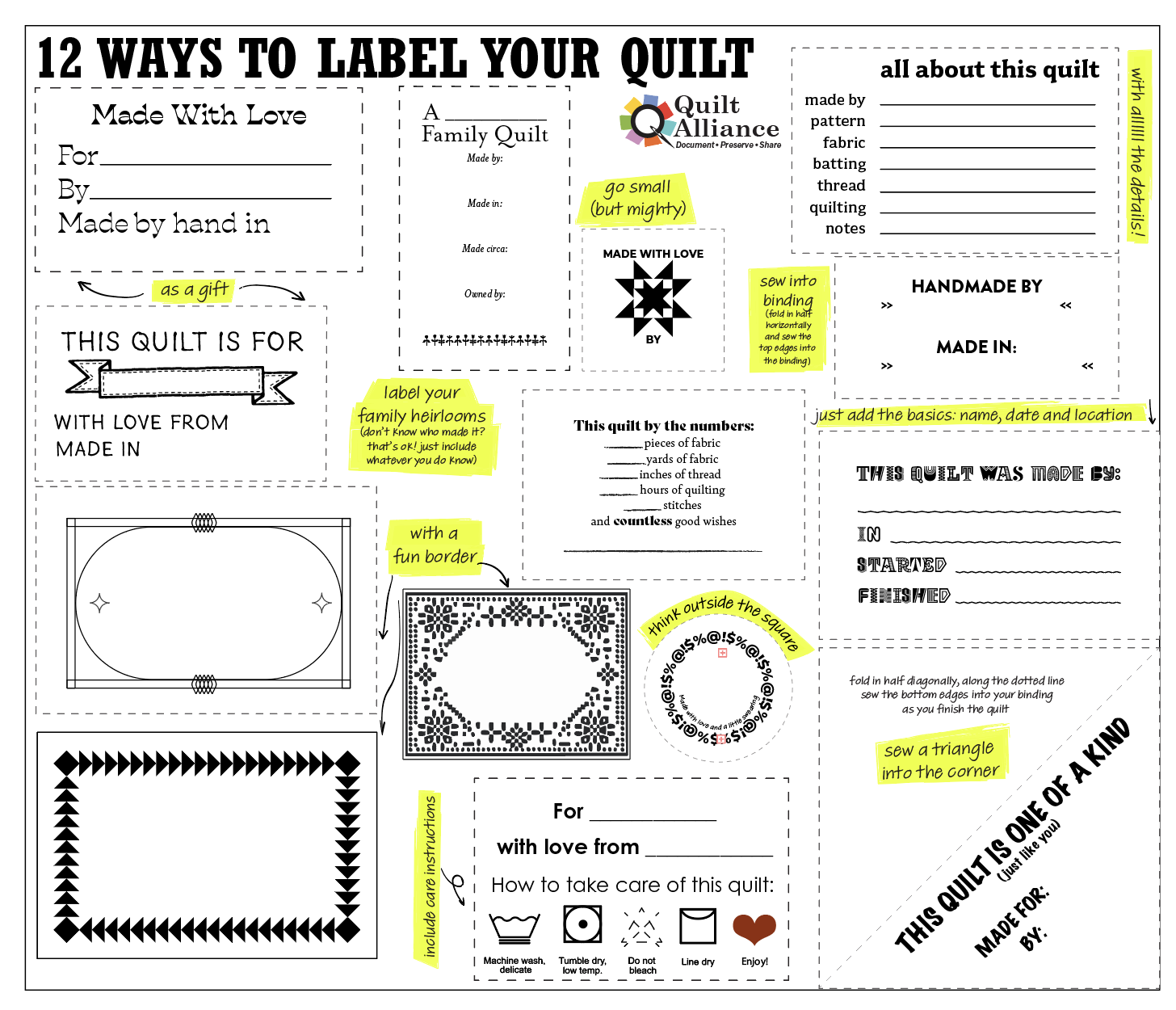 Come visit the Quilt Alliance booth #208 at QuiltCon in Phoenix! Pick up some free resources If you’re new to the Quilt Alliance, you’ll find brochures and handouts about: QA quilt documentation and oral history projects Membership for individuals and groups Handouts on quilt labeling, quilt care, and storage Sample quilt labels Sign the Labeling Pledge The Quilt Alliance’s motto is No More Anonymous Quiltmakers, and our booth includes a giant Labeling Pledge banner. Add your signature to the pledge, and take a pin and a selfie to let the world know your quilt history matters! Join! We have some fabulous new thank you gifts (see below) for all new members and current members who renew at a higher level. All items were selected to support your quilt documentation routine. Shop! Pick up some QA logo bling to show your support and look cute at the same time! We’ll have No More Anonymous Logo Tees, QA lapel pins, QA bandanas, and a super fun sticker sheet for sale.