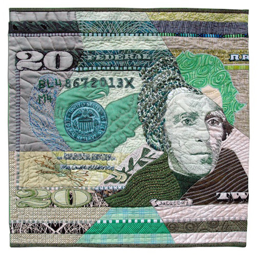 A.J.Maggi Gordon, Shahnaz Khan, Chad Lindsey, Ritchy McFadden, Michael Michalski, Michele Reisch, Eric Sciotto, and Melanie Vaughan201320″ x 20″Quilt Alliance’s TWENTY contest Materials: Commercial cotton, decorator fabrics, yarn, embroidery thread; machine and hand piecing and applique, embroidery, inkjet printing Artist’s Statement: Like a quilt, American currency (even though it has evolved over the years) wears its tradition proudly. It is useful yet also decorative, full of meaningful symbols harkening back to an earlier time. While often overlooked as just a part of everyday life, careful study shows the handiwork of many artisans. This is our first try at a ‘slice quilt’. Though quite diverse, our myriad viewpoints and talents came together quite nicely, our own American melting pot. Makers are members of the Broadway Gentlemen’s Quilting Auxiliary.