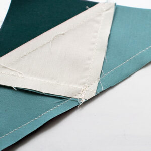 Do you see where the two wing triangles come together in the center? That’s a quarter inch between the edge and the start of the half square triangle! It allows you to make sure the half square triangle point lines up exactly with the next triangle sewn to the Corner Unit. Check that out below, right.