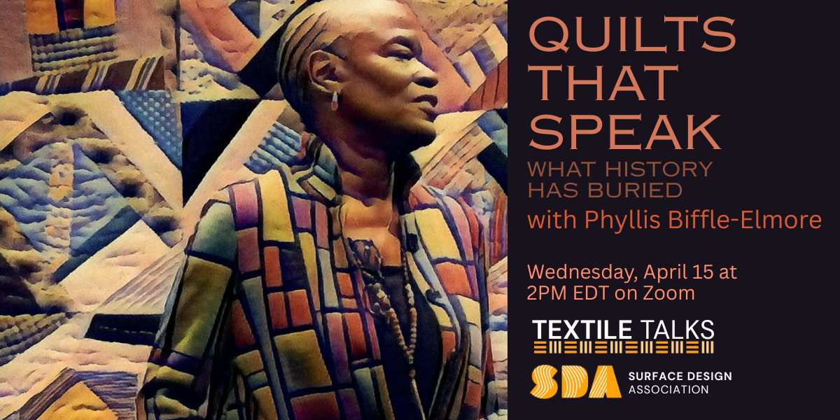 Textile Talks features weekly presentations and panel discussions from the International Quilt Museum, Quilt Alliance, Studio Art Quilt Associates, and Surface Design Association. The programs are held online at 2 pm Eastern / 11am Pacific US and Canada each Wednesday and last approximately one hour. Time zone converter.