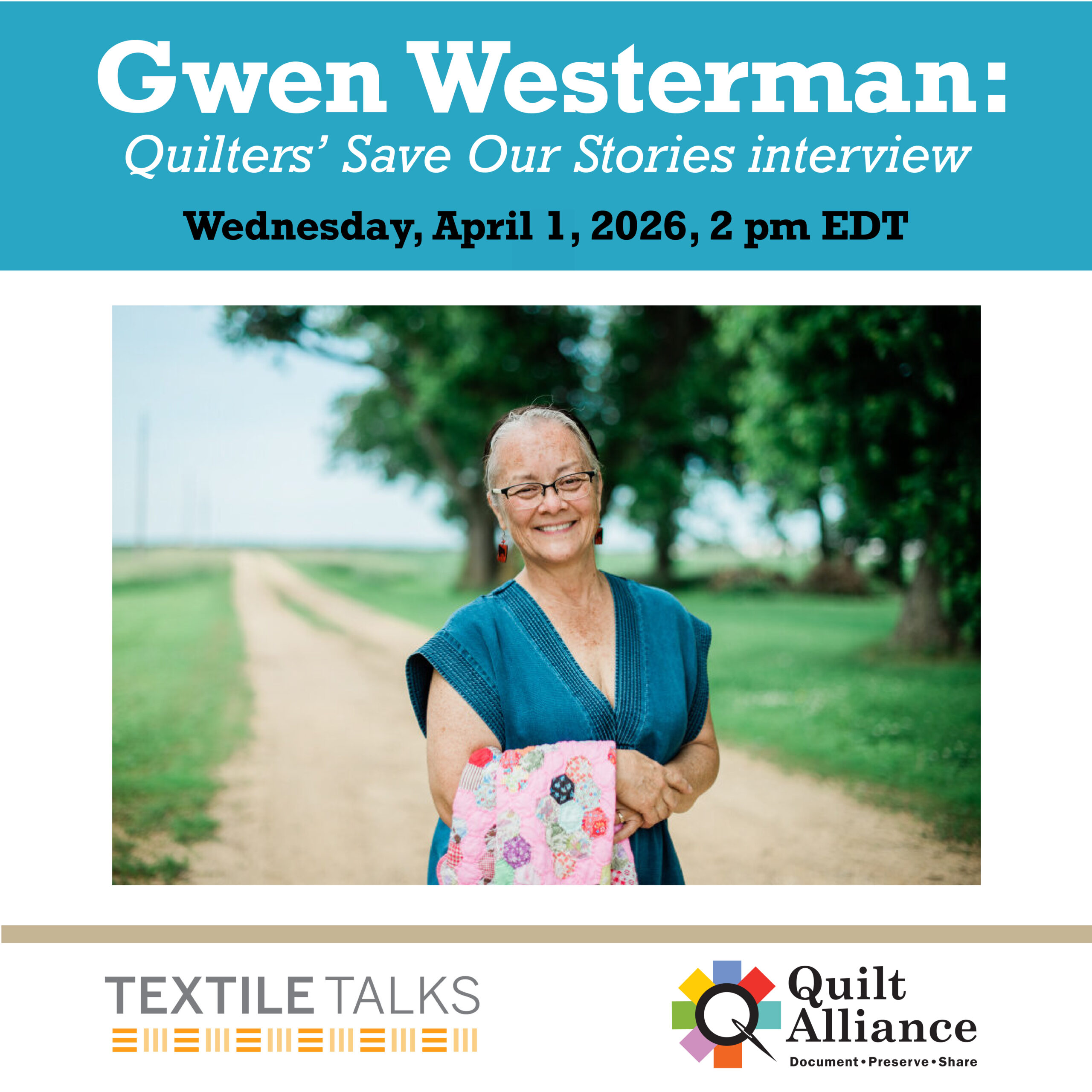 Join us for an oral history interview with quiltmaker, poet, and educator Gwen Westerman for the Quilters’ Save Our Stories project (QSOS). The grassroots QSOS project has been documenting the lives of quiltmakers for more than two decades. QSOS is not only the largest collection of interviews with quilters, but also the largest grassroots oral history project of its kind in the world. Gwen’s interview will be archived with the rest of the historic QSOS collection on the QSOS website, at the American Folklife Center at the Library of Congress, and at the Louie B. Nunn Center for Oral History at the University of Kentucky.