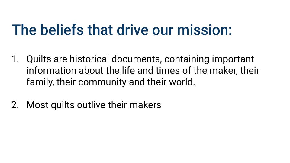 The nonprofit Quilt Alliance has an easy-to-remember vision statement: No More Anonymous Quilters. We help quilt makers and quilt owners document, preserve, and share the stories of quilts and their makers. This presentation starts with the story of a simple quilt made in 1863 by a Sunday school class in Maine that has an incredible backstory that underscores the power and value of quilt documentation. We’ll share examples from the QA’s two grassroots projects, Quilters’ Save Our Stories oral history project and Go Tell It, a video documentation project. Examples included in the talk will be customized for your organization and location when possible. We’ll talk about the ways members of your group can use each project to record and preserve stories in your community. Three key steps for quilt documentation will be emphasized: labeling, photography, and writing.