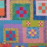 MS: When I first started quilting, I really felt like I couldn’t just–I have three boys and at the time I was in the middle of having them and I wanted to quilt all the time, and I felt like I couldn’t justify quilting unless I was making a quilt for someone. I belonged to this play group through Parks and Rec in Valdez, Alaska and all the moms would make a quilt block for a mother who was pregnant with a new baby. I’d gather all the blocks, and I would be the person that would put them into a quilt. One of the women who was teaching me to quilt was an older woman. She was a grandmother and she would bring her granddaughter to this play group, and she introduced me to Gwen Marston’s book called “Liberated Quiltmaking.” And she said, ‘We don’t have to put these regular sashes on the quilt. We can do whatever we want.’ And so I really find that is important to me. You know the rules, but then you get to break them. I started just doing this crazy stuff, where I would put in other blocks, but there is a method to it. I would build the blocks into strips, so as long as you end up with strips that are the same length you just attach them. I started teaching this technique at the quilt shop in Valdez, and people were interested in it, but they were kind of intimidated. So I thought I’m going to do a dummied down version, which is what “Boxy 9-Patch” is. It is just nine patches, which is about as simple as you can get, and then strips of different sizes and lengths and shapes, and I would build those out around the nine patches. I guess the other thing that is interesting about this quilt is when we moved from Valdez to Anchorage I started teaching at a quilt shop here called The Quilt Tree, and I had someone call me and ask if she could buy a quilt. She didn’t end up buying the quilt, but it made me think, oh maybe, maybe my stuff is good enough that I should send it out. I had some of my pieces professionally photographed and “Boxy 9-Patch” is the first one, not the first one to be accepted into a show, but the first one to get a ribbon and it got first place at the Albuquerque Fiber Arts Fiesta so it is a special quilt to me for those reasons.