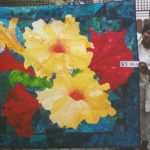 JY: I’m going to keep on keeping on. [laughs.] I am now exploring I think more seriously because I think I have kind of solved the problem, which for a while I was trying to do with several quilts, was trying to solve the problem of working with flowers that looked real enough without overly augmenting them with other mediums like paint. That one does have some fabric paint to give some depth to the flowers and it does have some thread work on it. But I didn’t want to stretch as far as actually painting, you know, using acrylic paint but I will use fabric markers and maybe some diluted dyes because I think dyes, inks don’t change the hand of the fabric. I didn’t really want to change the hand of the fabric because I still think quilts even though they’re for the wall still have this tactical snugness, the feeling of comfort that I want to preserve. I don’t really want my work to feel like I’ve got a stiff canvas even though it is three layers. So I think I have pretty much solved what I want to do with the flower part of it. I think now I’m looking more at what I can do to enhance the background. So my current piece is also a flower but I’ve now fractured it with curved lines in a grid and that sort of thing so I guess it is a step beyond this piece.