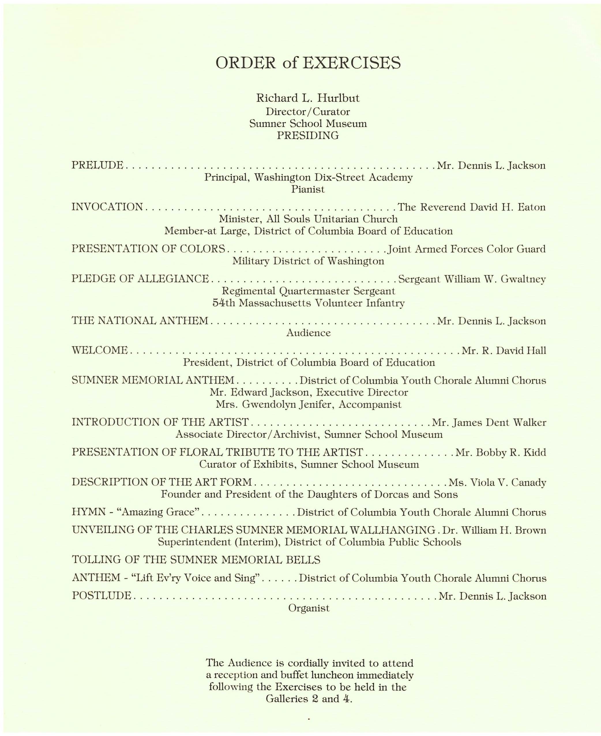 Charles Sumner Memorial Wall Hanging Dedication-Order of Services